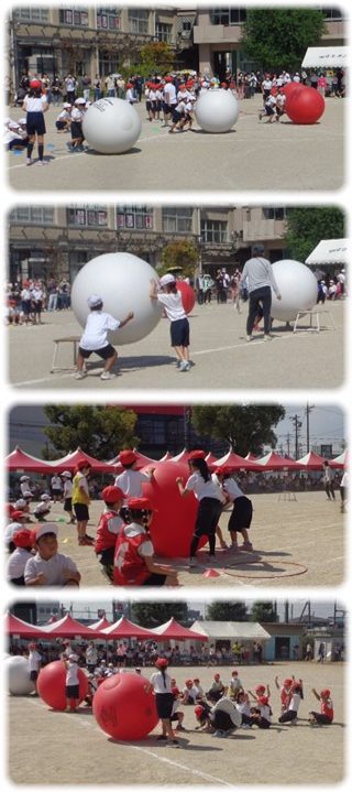 指先を下にした掌で、下から押し上げるように転がすことも、練習でしっかり身についたようで、走る子どもたちを置いてきぼりにするほど大玉が勢いよく転がるペアもありました。