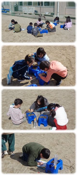 1年生が、校舎の前で育てているチューリップを運動場に持ち出して観察していました。
