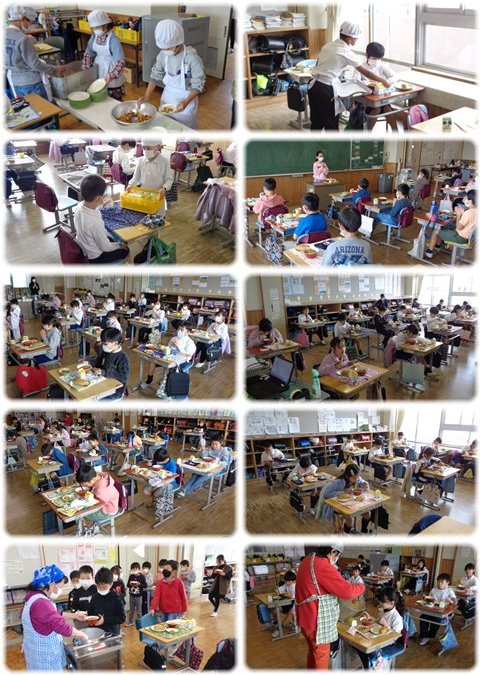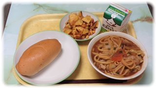 メニューは、…地物たっぷりみそ煮込みうどんとさつまビーンズ、小型玄米パン、そして牛乳です。