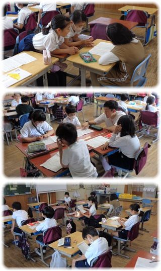 子どもたちは、キーワードの「ほご色」と、段落の始めの接続詞も意識しながら文章を読み、班の友だちと一緒に、答えを探していました。