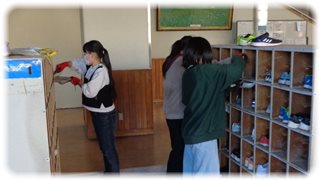 靴を外に出して、一つ一つ靴箱の土を掃き出したうえで、床を掃いて全体をきれいにしていました。