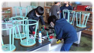実験器具などを洗う流しを、一つずつ分担して、洗剤をつけたスポンジで磨いていました。