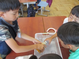 グループごとに、ペットボトルやアルミ缶に入っている水のかさを調べます。