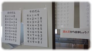 あるクラスでは、九九を書いた紙が、暖簾のように出入口に貼られています。