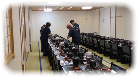その前に、夕食会場をのぞくと、旅館スタッフの方が熱心に準備中でした。