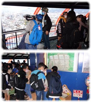 エレベーターに分乗して、地上100mの展望室に上がった子どもたちは、窓越しに肉眼で、望遠鏡をのぞいて、また、観光案内タッチパネルなどを見て、夕暮れ時の京都市内の景色を眺めていましたが、いつの間にか残る子はわずかに。