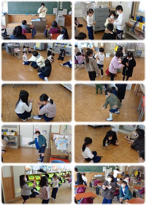 生活科で、竹ぽっくりなどの昔の遊びを楽しんでいる1年生。