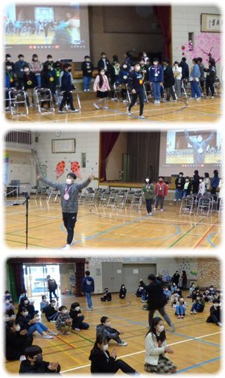 体育館に全員が集まることはできませんでしたが、ICTの力で全校児童がつながりました。