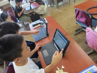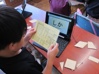 文字入力も、タイピングでスイスイ入力する子もいれば、ローマ字表を見ながら1文字ずつ確実に入力する子、手書きで書いていく子などさまざまな方法で入力していました。発表ノートに文字を入力する方法はみんな分かっているようで、「先生、どうしたらいいですか?」の質問の声はあがりませんでした。これから、どんどん使えるようになっていきますね。