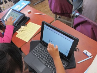 算数の学習と同時にタブレットを使う学習も兼ねていました。指でドラッグして図形を動かしたり、文字を入力したり、2年生なりに少しずつタブレットが使えるように、授業の中でトレーニングもしていきます。
