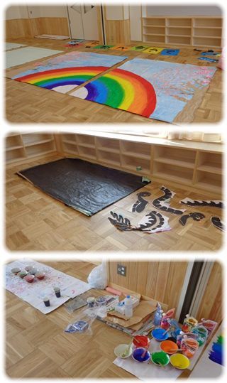 3階、5年3組の隣の教室の床には、写真のとおり、でっかい虹の描かれた紙や真っ黒に塗られた紙が広げられています。