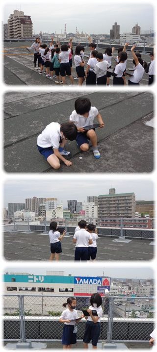 こうして方角を確かめた子どもたちは、それぞれの方角の屋上の端、フェンスの近くまで行って、その方向に見える町の風景をタブレットに納めていました。