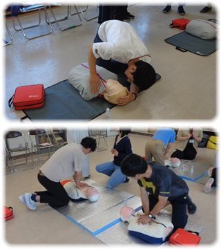 参加した教員全員が立場をかわりながら、人形を相手に胸骨圧迫とAED使用を体験しましたが、皆、表情は真剣。