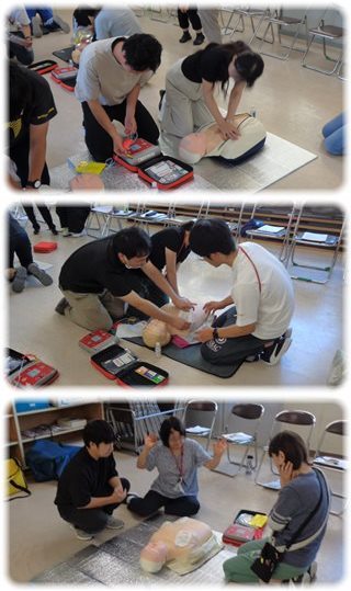 次は、AED(自動体外式除細動器)を使った救命実習へ。