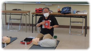 これも、まず、講師によるAED各部の説明や実演して見せながらの使用方法の説明で、手順や留意事項、配慮することをしっかり学んでから、グループごとに実習しました。