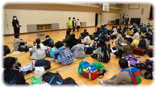 そして、バスを降りて体育館へ歩いていくと、そこにはすでにたくさんのおうちの人が迎えに来てくれていました。