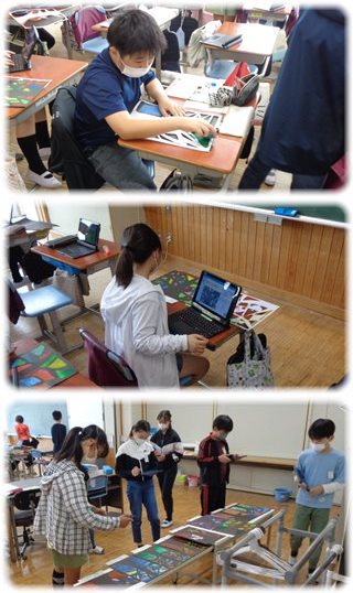 タブレットを使って、撮影した自分と友達の作品の写真を「発表ノート」に貼り付け、工夫や努力、よさを記入していました。