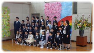 式が終わった子どもたちは、保護者の皆さんと6年生が退出した後、壁面飾りの前にしつらえたひな壇に並んで立ち、学級写真を撮影しました。