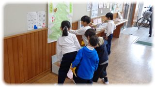 2時間目が終わり、校長室へと階段を降りていくと、「浜田っ子掲示板」の前に子どもが。
