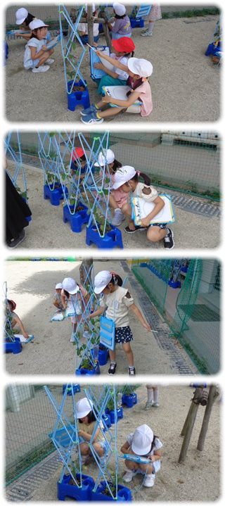 子どもたちは、自分のアサガオを愛おしそうに見て、触っては、ワークシートにアサガオの絵を描いていました。