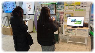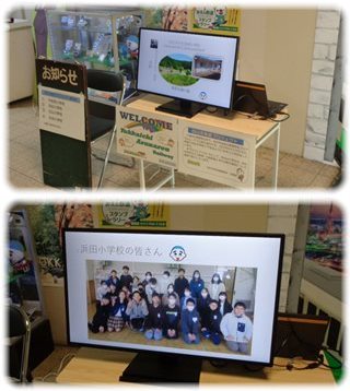 あすなろう鉄道 四日市駅のコンコースに置かれたモニターに、アナウンスしている子どもの名前と学校名、そして、紹介している施設の名前と写真が写り、スピーカーから、浜田っ子の英語でのアナウンスが聞こえてきます。
