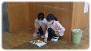 朝の会をしている頃に階段を上っていくと、2階ホールの給食用エレベーターの前に5年生2人がしゃがんでいました。