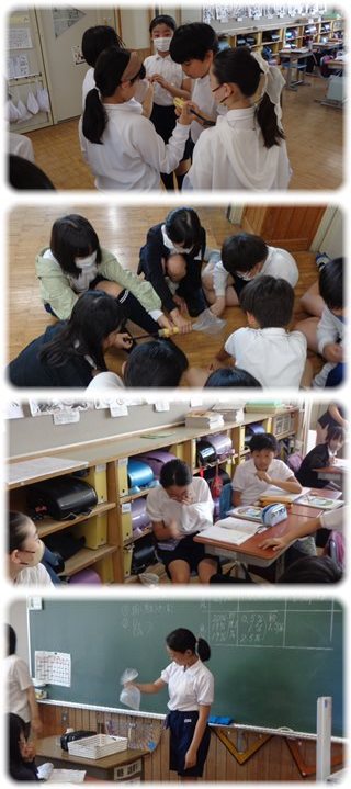 前に出て実験をした子が、ビニル袋をシャカシャカ振ると、透明だった石灰水は…。