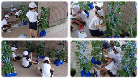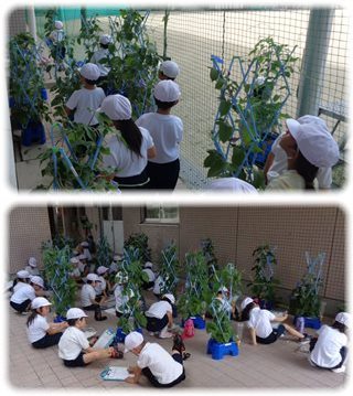 子どもたちは、アサガオの種をまいたとき、芽を出したときのことを思い出して、その成長と変化に驚き、感動しながら観察と記録を続けていました。