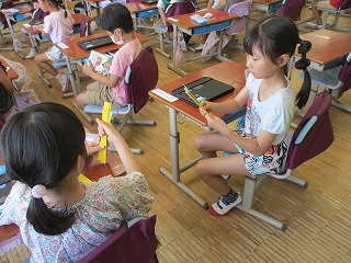 その後、お友達が何を使ってどのように測ったのか、交流しました。お友達の様子をしっかり見て、自分の測り方と比べることができました。