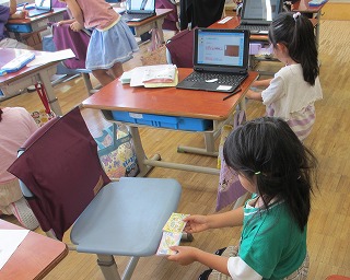 1年生は、まだ長さの単位を学んでおらず、長さを比べるときは、端をそろえたり、テープに写しとったり、また何かを1と見立ててそのいくつ分かで考えたりします。今日は、「机の縦と横の長さを測りたい。でも、テープがないから写し取ってくらべることができない!」という設定で授業が始まりました。