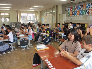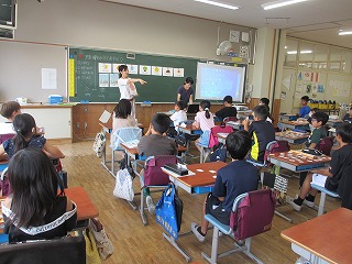 外国語の時間は、時々ボランティアさんにもお手伝いいただいています。今日は、原さんにお世話になり、英単語の発音の仕方を教えてもらいました。原さんの素敵な発音の後、子どもたちが真似をして発音しました。