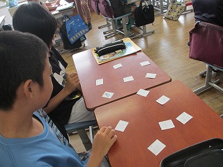 その後は、カードを使って神経衰弱。お隣の友達のカードも使って、行いました。 1枚めくって出たカードの単語を発音します。同じカードが揃えばゲットできます。