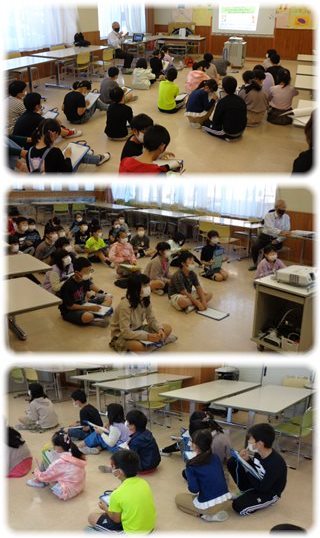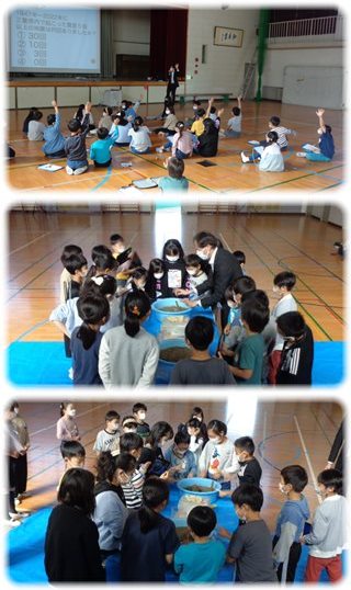 体育館に集まった子どもたちは、全体でこの時間の体験学習の流れを確認した後、学級ごとに3つの場所に分かれていきました。