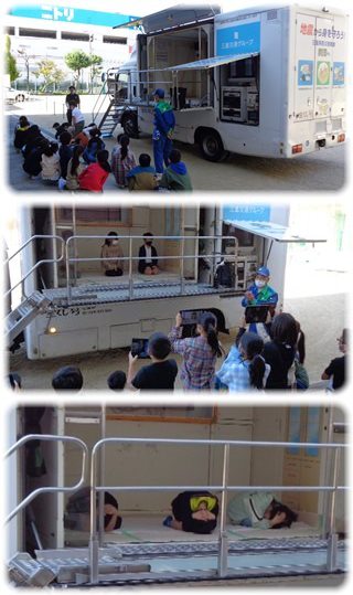 運動場にとめられた“地震体験車”に3人ずつ乗って、地震の揺れを体験しました。