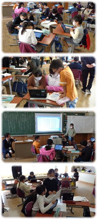 子どもたちは、“接続後は適切か”“観点に会った説明がされているか”“「始め」「中」「終わり」の構成になっているか”…、といったことを意識しながら文章を読み、気づいたことをタブレットに書きこんだうえで、班で一つの資料にまとめて発表しました。