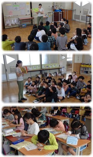 映像を見ながらリズムに合わせていろいろな国の挨拶を唱えた子どもたちに、教師からプレゼント。