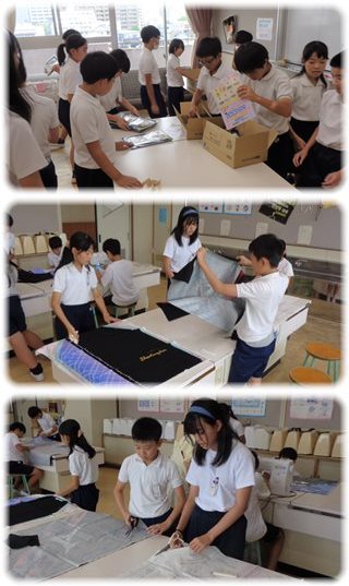 子どもたちはテーブルに布を広げ、はさみでその布を裁ち始めました。