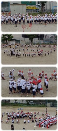 トラックに沿って横にズラーと並び、担当の教師の説明を聞いて進め方や隊形、移動のことを確かめながら進めていました。