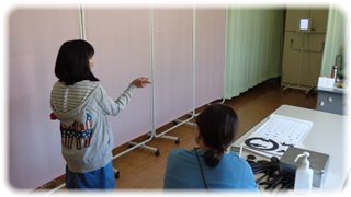 前方の白く小さいモニターに現れた「C」の形の「ランドルト環」を見て、切れている方を指で示して見えているかどうかを判断します。