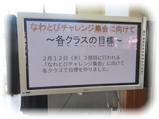 高い目標を持ち、その達成に向けて大切なポイントを整理しています。すべての学級の目標が、次々に画面に表れ、こどもたちの気分を盛り上げています。