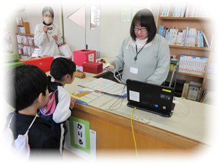 今回は、図書室体験なので、浜田小学校のこどもたちと同じように、「本を借りる」体験もしてもらいました。バーコードでの貸し出し処理に、園児たちは興味津々です。
