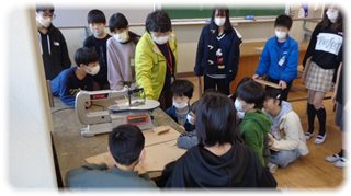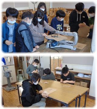 数台の電動のこぎりに分かれて、作業に取り掛かった子どもたちは、ちょっと怖そうな様子を見られましたが、班の友だちと教え合い確かめ合って、慎重に作業を進めていました。