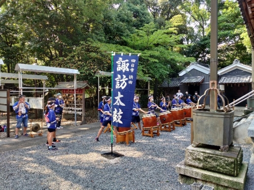 今日は諏訪太鼓が披露されました。夏休みの間も何度も練習してきました。地域や保護者の皆さんのお手伝いがあって、今日のお披露目になりました。