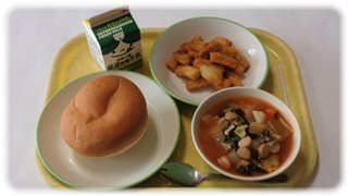 メニュー:ミネストローネ、いかとじゃがいものレモン風味あげ、米粉パン、牛乳
