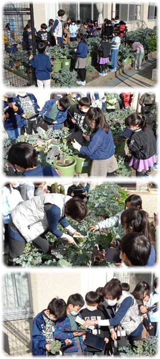 教室に戻った子どもたちは、とった写真をタブレットのモニターに映し出し、ワークシートに絵と文で観察記録をまとめました。