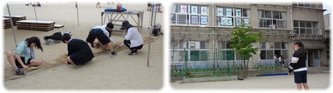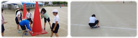 ◇入場門のコーンの中に重しのために水を入れていたら、突然出た水が顔や体にかかった子が。コーナーの中心で巻き尺を押さえて、ラインを引く教師を助けます。