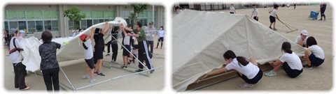 ◇本部席、来賓席のテント張りの補助。天幕を骨組みにかけたりその端を縛ったり。