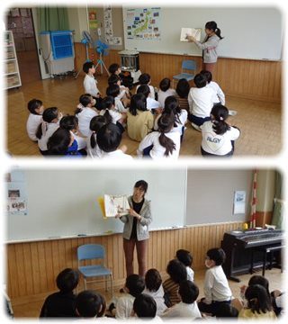 教師が英語で話す自己紹介を聴いたり、簡単な英語で隣の子と自己紹介をしあって過ごし、教師の絵本の読み聞かせを聴きました。