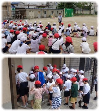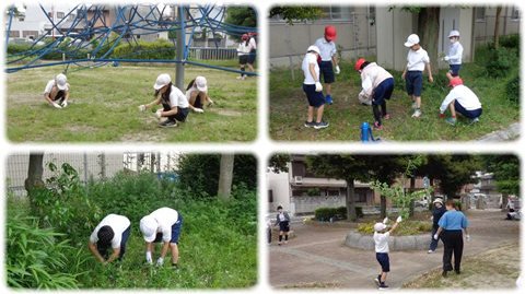 今日の1限目、全校のみんなが外に出て、校庭と浜田公園の草を取る「草取り集会」を開きました。