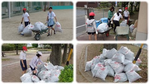 ここでは、美化委員が活躍。一輪車を押して各学年の担当区域を回って草の入った袋を回収し、浜田公園の北東隅と体育館東のごみ置き場へ運びました。